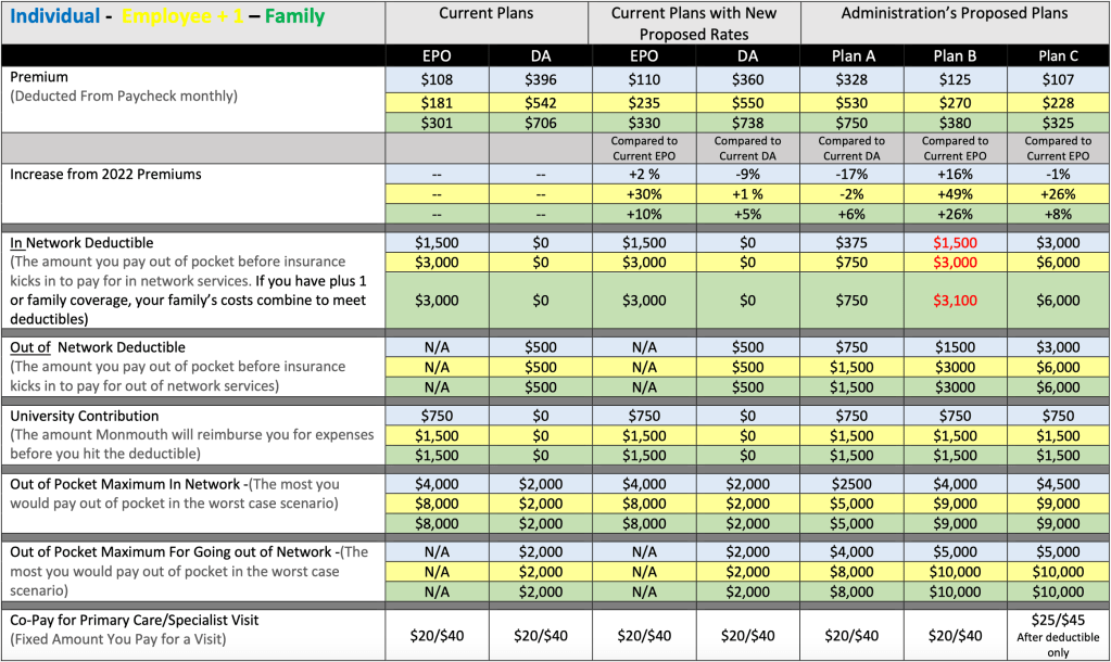 The administration has also indicated that they plan to bid out for new health benefits vendors as early as April 2023 (i.e. the University may move to another network, such as Aetna, or United Healthcare, for example, and/or may move to a new prescription benefits manager). That means that any changes in plan designs accepted now could be up for renegotiation in the year ahead.